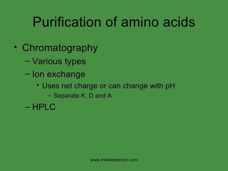 - 13. Purification of amino acids Chromatography Various types Ion exchange Uses net charge or can change with pH Separate K, D and A HPLC www.freelivedoctor.com