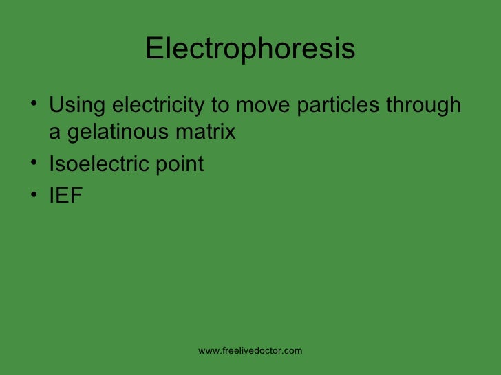 - 14. Electrophoresis Using electricity to move particles through a gelatinous matrix Isoelectric point IEF www.freelivedoctor.com