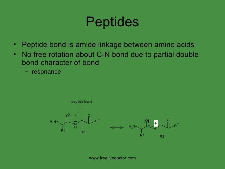 - 15. Peptides Peptide bond is amide linkage between amino acids No free rotation about C-N bond due to partial double bond character of bond resonance www.freelivedoctor.com