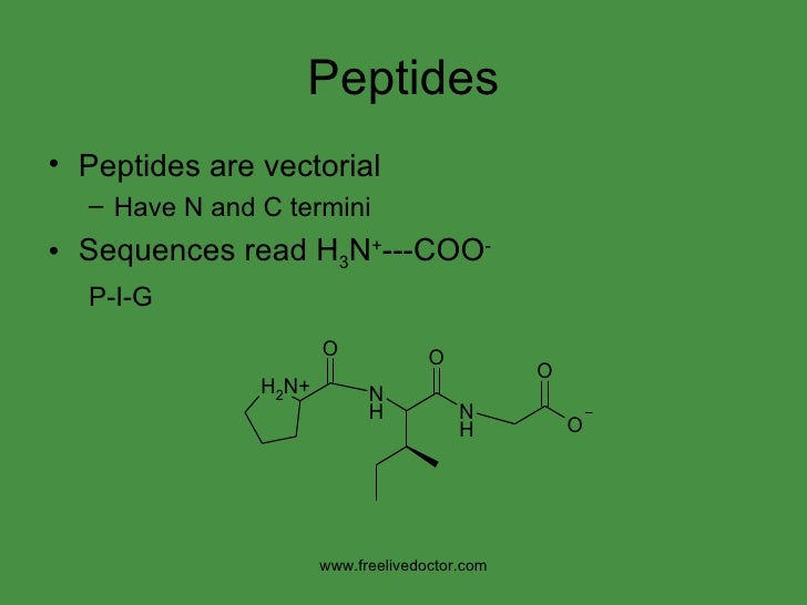 - 17. Peptides Peptides are vectorial Have N and C termini Sequences read H 3 N + ---COO - P-I-G www.freelivedoctor.com