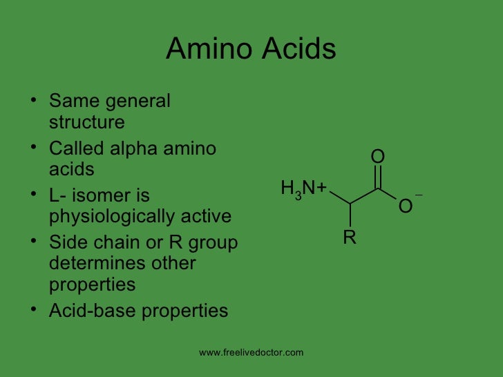 - 2. Amino Acids Same general structure Called alpha amino acids L- isomer is physiologically active Side chain or R group determines other properties Acid-base properties www.freelivedoctor.com