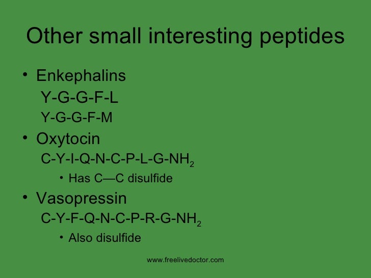 - 20. Other small interesting peptides Enkephalins Y-G-G-F-L Y-G-G-F-M Oxytocin C-Y-I-Q-N-C-P-L-G-NH 2 Has C—C disulfide Vasopressin C-Y-F-Q-N-C-P-R-G-NH 2 Also disulfide www.freelivedoctor.com