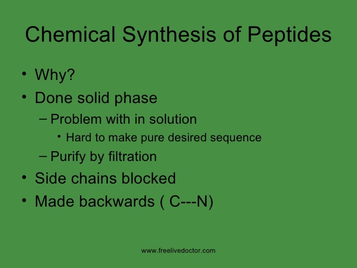 - 21. Chemical Synthesis of Peptides Why? Done solid phase Problem with in solution Hard to make pure desired sequence Purify by filtration Side chains blocked Made backwards ( C---N) www.freelivedoctor.com