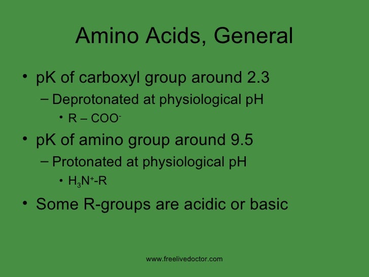 - 3. Amino Acids, General pK of carboxyl group around 2.3 Deprotonated at physiological pH R – COO - pK of amino group around 9.5 Protonated at physiological pH H 3 N + -R Some R-groups are acidic or basic www.freelivedoctor.com