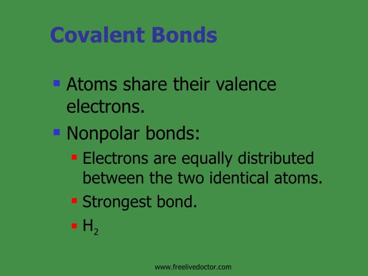 - 10. Covalent Bonds Atoms share their valence electrons. Nonpolar bonds: Electrons are equally distributed between the two identical atoms. Strongest bond. H 2 www.freelivedoctor.com