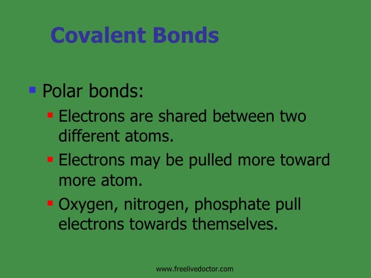 - 13. Covalent Bonds Polar bonds: Electrons are shared between two different atoms. Electrons may be pulled more toward more atom. Oxygen, nitrogen, phosphate pull electrons towards themselves. www.freelivedoctor.com