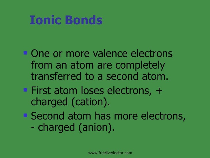 - 15. Ionic Bonds One or more valence electrons from an atom are completely transferred to a second atom. First atom loses electrons, + charged (cation). Second atom has more electrons, - charged (anion). www.freelivedoctor.com