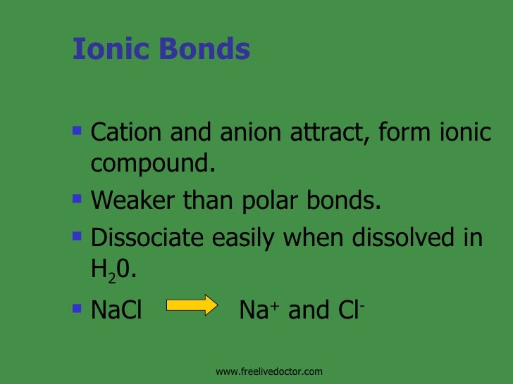 - 16. Ionic Bonds Cation and anion attract, form ionic compound. Weaker than polar bonds. Dissociate easily when dissolved in H 2 0. NaCl Na + and Cl - www.freelivedoctor.com