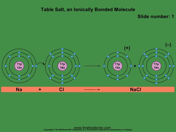 - 17. www.freelivedoctor.com Table Salt, an Ionically Bonded Molecule Slide number: 1 Copyright © The McGraw-Hill Companies, Inc. Permission required for reproduction or display. 17p 18n 11p 12n 11p 12n 17p 18n + (+) (–) Na Cl + NaCl