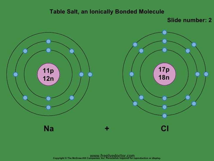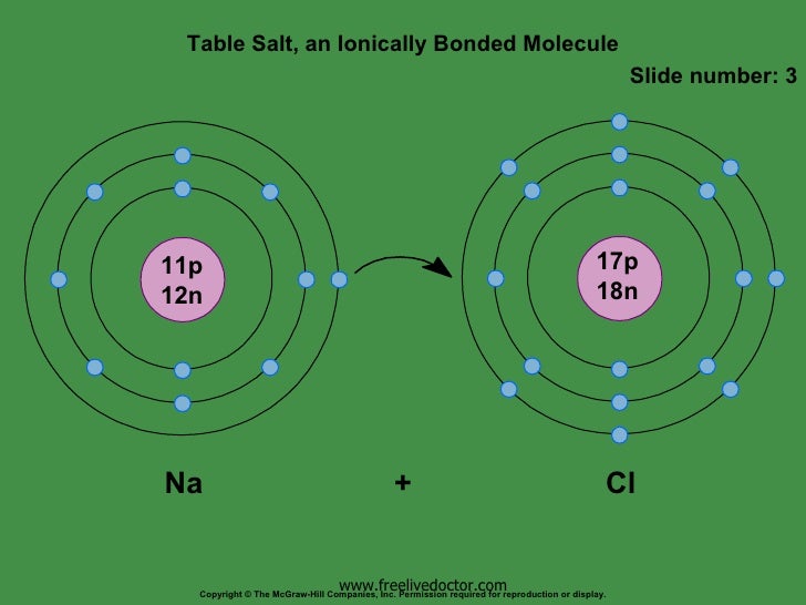 - 18. Na Cl + www.freelivedoctor.com Table Salt, an Ionically Bonded Molecule Slide number: 2 Copyright © The McGraw-Hill Companies, Inc. Permission required for reproduction or display. 17p 18n 11p 12n