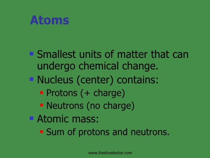 - 2. Atoms Smallest units of matter that can undergo chemical change. Nucleus (center) contains: Protons (+ charge) Neutrons (no charge) Atomic mass: Sum of protons and neutrons. www.freelivedoctor.com