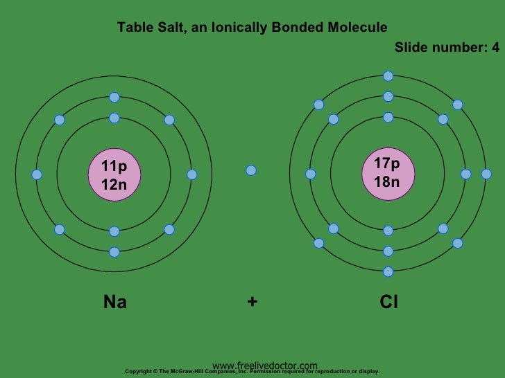 - 19. Na Cl + www.freelivedoctor.com Table Salt, an Ionically Bonded Molecule Slide number: 3 Copyright © The McGraw-Hill Companies, Inc. Permission required for reproduction or display. 17p 18n 11p 12n