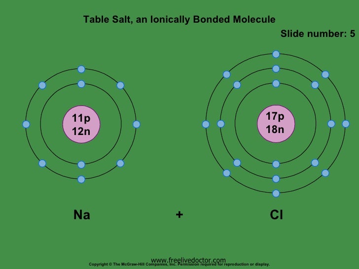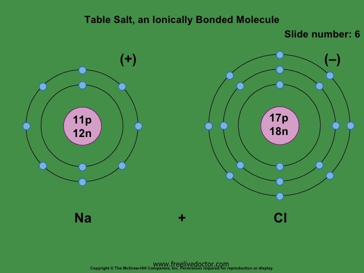 - 22. Na Cl + (+) (–) www.freelivedoctor.com Table Salt, an Ionically Bonded Molecule Slide number: 6 Copyright © The McGraw-Hill Companies, Inc. Permission required for reproduction or display. 17p 18n 11p 12n