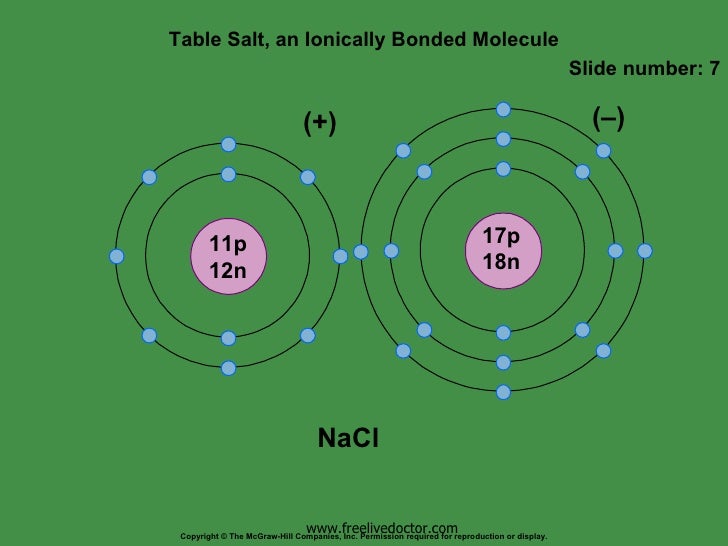 - 23. NaCl www.freelivedoctor.com Table Salt, an Ionically Bonded Molecule Slide number: 7 Copyright © The McGraw-Hill Companies, Inc. Permission required for reproduction or display. 11p 12n (+) 17p 18n (–)