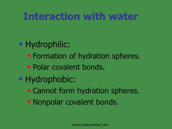 - 25. Interaction with water Hydrophilic: Formation of hydration spheres. Polar covalent bonds. Hydrophobic: Cannot form hydration spheres. Nonpolar covalent bonds. www.freelivedoctor.com