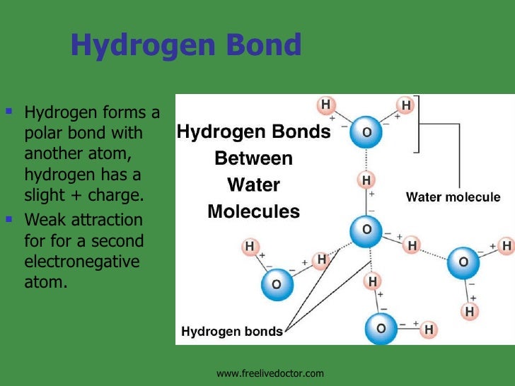 - 26. Hydrogen Bond Hydrogen forms a polar bond with another atom, hydrogen has a slight + charge. Weak attraction for for a second electronegative atom. www.freelivedoctor.com