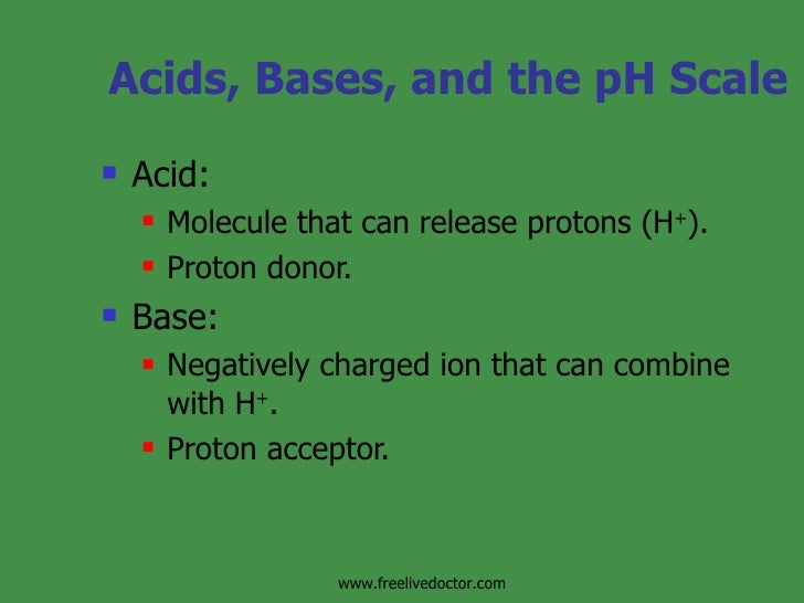 - 27. Acids, Bases, and the pH Scale Acid: Molecule that can release protons (H + ). Proton donor. Base: Negatively charged ion that can combine with H + . Proton acceptor. www.freelivedoctor.com