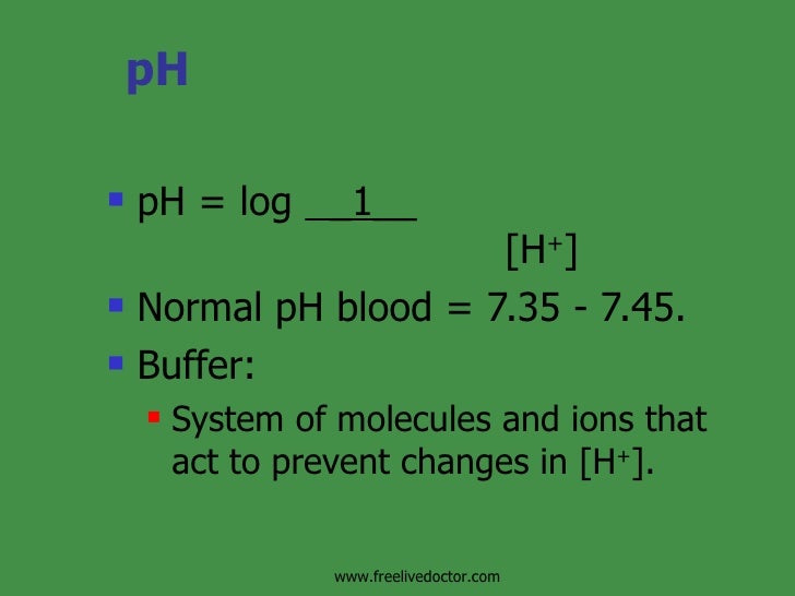- 28. pH pH = log _1__ [H + ] Normal pH blood = 7.35 - 7.45. Buffer: System of molecules and ions that act to prevent changes in [H + ]. www.freelivedoctor.com