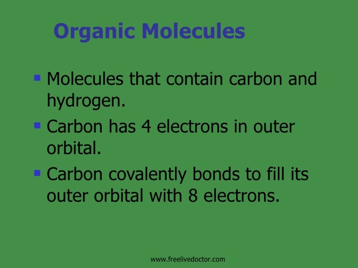 - 29. Organic Molecules Molecules that contain carbon and hydrogen. Carbon has 4 electrons in outer orbital. Carbon covalently bonds to fill its outer orbital with 8 electrons. www.freelivedoctor.com
