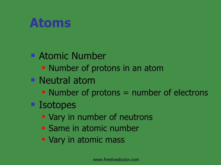 - 3. Atoms Atomic Number Number of protons in an atom Neutral atom Number of protons = number of electrons Isotopes Vary in number of neutrons Same in atomic number Vary in atomic mass www.freelivedoctor.com