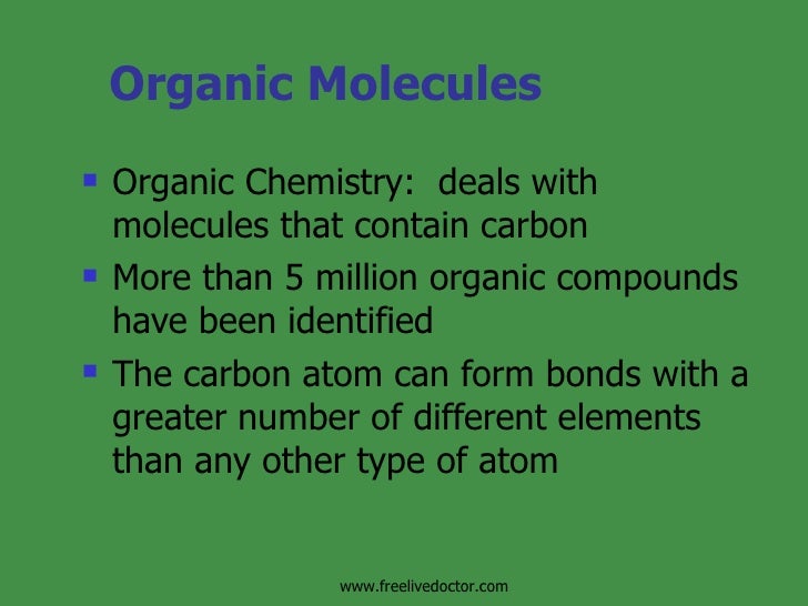 - 30. Organic Molecules Organic Chemistry: deals with molecules that contain carbon More than 5 million organic compounds have been identified The carbon atom can form bonds with a greater number of different elements than any other type of atom www.freelivedoctor.com