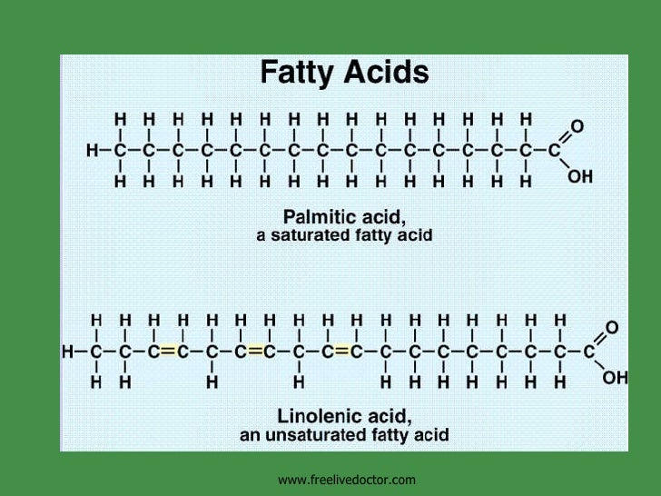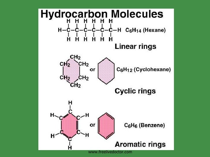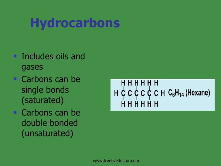 - 38. Hydrocarbons Includes oils and gases Carbons can be single bonds (saturated) Carbons can be double bonded (unsaturated) www.freelivedoctor.com