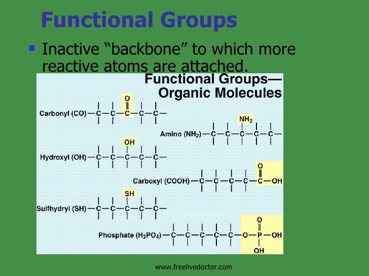 - 32. Functional Groups Inactive “backbone” to which more reactive atoms are attached. www.freelivedoctor.com