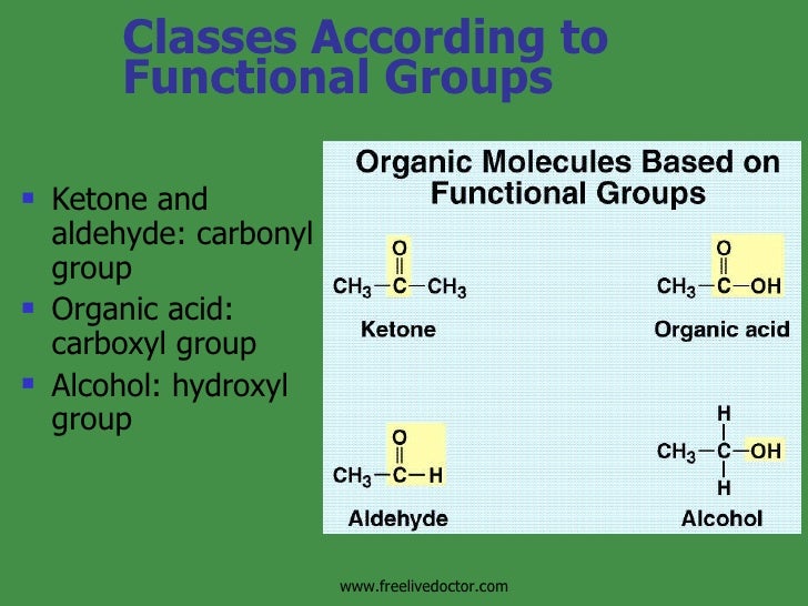 - 33. Classes According to Functional Groups Ketone and aldehyde: carbonyl group Organic acid: carboxyl group Alcohol: hydroxyl group www.freelivedoctor.com