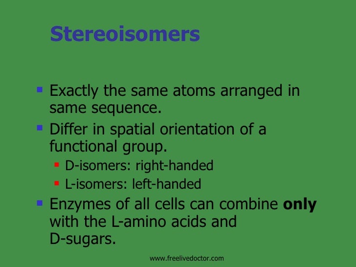 - 34. Stereoisomers Exactly the same atoms arranged in same sequence. Differ in spatial orientation of a functional group. D-isomers: right-handed L-isomers: left-handed Enzymes of all cells can combine only with the L-amino acids and D-sugars. www.freelivedoctor.com