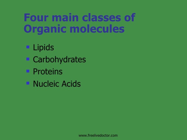 - 35. Four main classes of Organic molecules Lipids Carbohydrates Proteins Nucleic Acids www.freelivedoctor.com