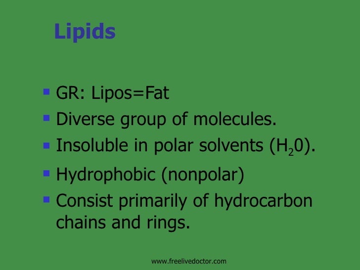 - 36. Lipids GR: Lipos=Fat Diverse group of molecules. Insoluble in polar solvents (H 2 0). Hydrophobic (nonpolar) Consist primarily of hydrocarbon chains and rings. www.freelivedoctor.com
