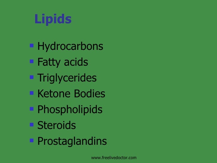 - 37. Lipids Hydrocarbons Fatty acids Triglycerides Ketone Bodies Phospholipids Steroids Prostaglandins www.freelivedoctor.com