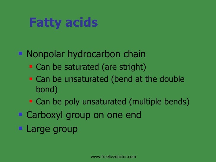 - 39. Fatty acids Nonpolar hydrocarbon chain Can be saturated (are stright) Can be unsaturated (bend at the double bond) Can be poly unsaturated (multiple bends) Carboxyl group on one end Large group www.freelivedoctor.com