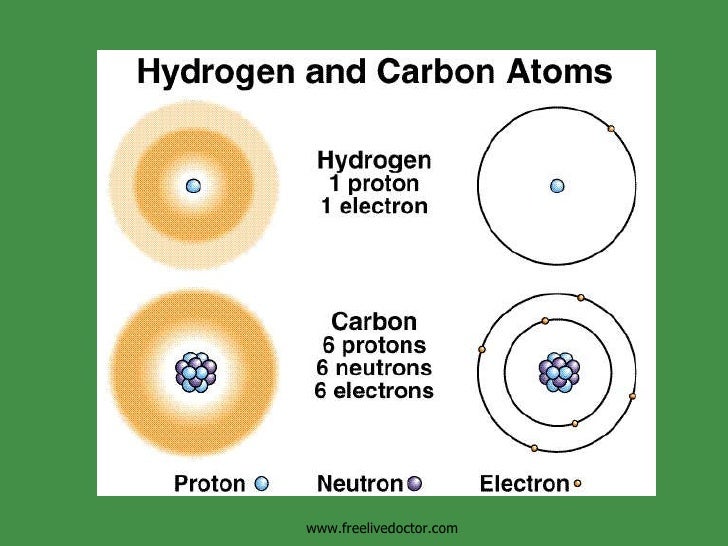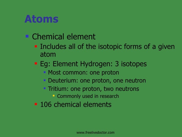 - 4. Atoms Chemical element Includes all of the isotopic forms of a given atom Eg: Element Hydrogen: 3 isotopes Most common: one proton Deuterium: one proton, one neutron Tritium: one proton, two neutrons Commonly used in research 106 chemical elements www.freelivedoctor.com