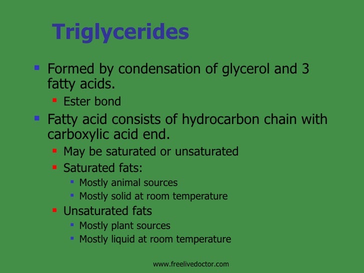 - 41. Triglycerides Formed by condensation of glycerol and 3 fatty acids. Ester bond Fatty acid consists of hydrocarbon chain with carboxylic acid end. May be saturated or unsaturated Saturated fats: Mostly animal sources Mostly solid at room temperature Unsaturated fats Mostly plant sources Mostly liquid at room temperature www.freelivedoctor.com