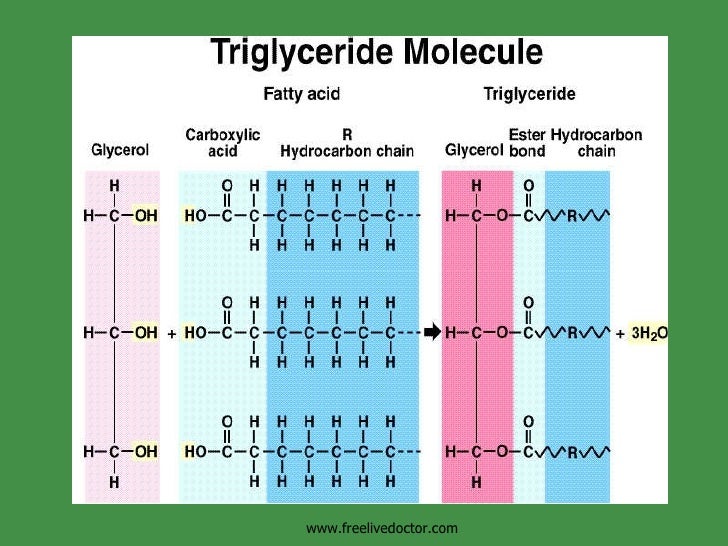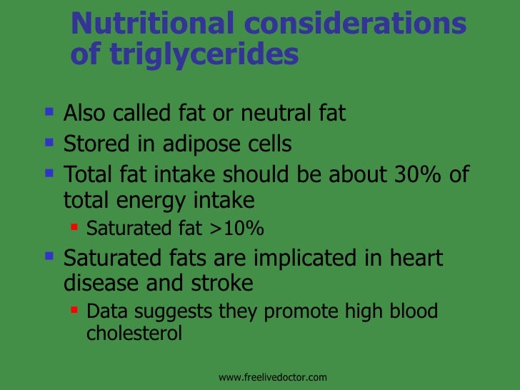 - 43. Nutritional considerations of triglycerides Also called fat or neutral fat Stored in adipose cells Total fat intake should be about 30% of total energy intake Saturated fat >10% Saturated fats are implicated in heart disease and stroke Data suggests they promote high blood cholesterol www.freelivedoctor.com