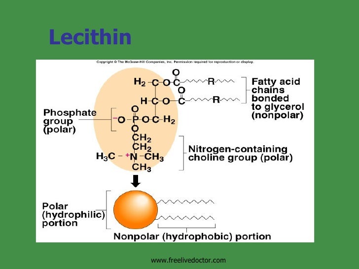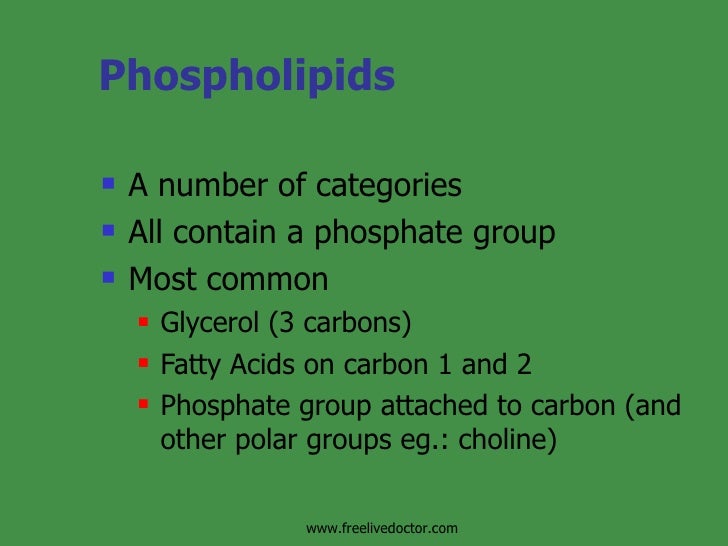 - 44. Phospholipids A number of categories All contain a phosphate group Most common Glycerol (3 carbons) Fatty Acids on carbon 1 and 2 Phosphate group attached to carbon (and other polar groups eg.: choline) www.freelivedoctor.com