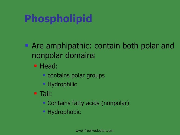 - 46. Phospholipid Are amphipathic: contain both polar and nonpolar domains Head: contains polar groups Hydrophilic Tail: Contains fatty acids (nonpolar) Hydrophobic www.freelivedoctor.com