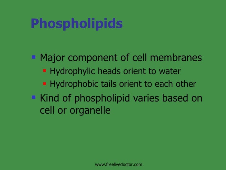 - 47. Phospholipids Major component of cell membranes Hydrophylic heads orient to water Hydrophobic tails orient to each other Kind of phospholipid varies based on cell or organelle www.freelivedoctor.com