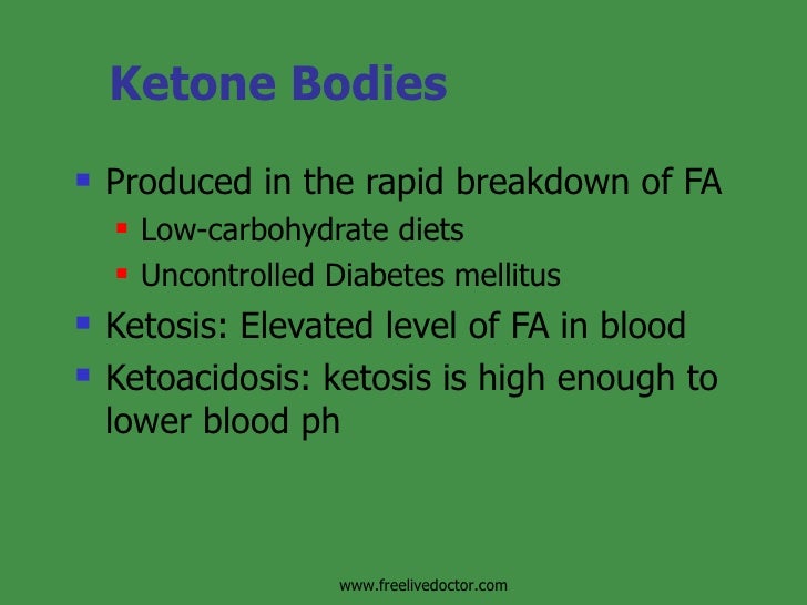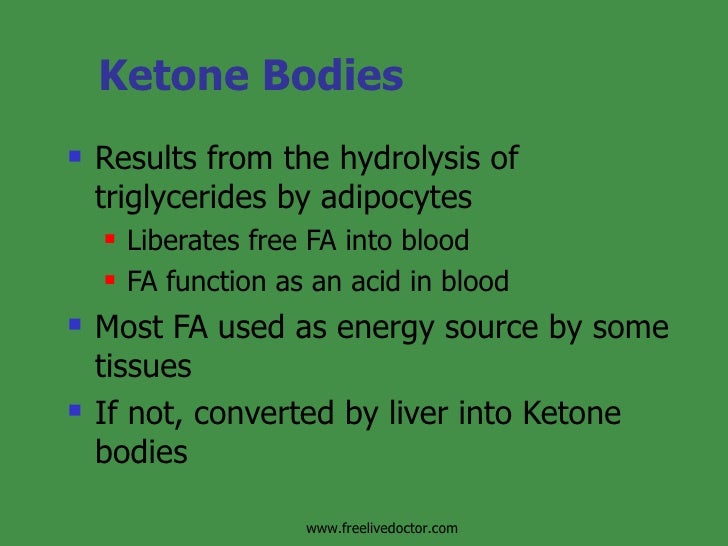 - 49. Ketone Bodies Results from the hydrolysis of triglycerides by adipocytes Liberates free FA into blood FA function as an acid in blood Most FA used as energy source by some tissues If not, converted by liver into Ketone bodies www.freelivedoctor.com