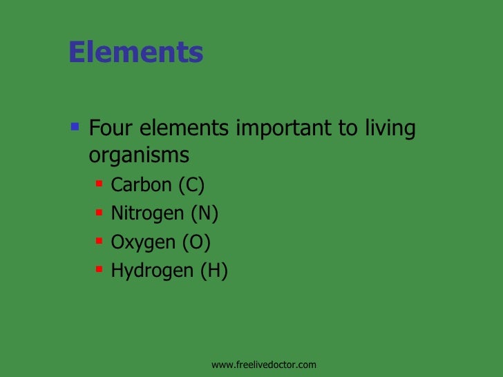 - 5. Elements Four elements important to living organisms Carbon (C) Nitrogen (N) Oxygen (O) Hydrogen (H) www.freelivedoctor.com