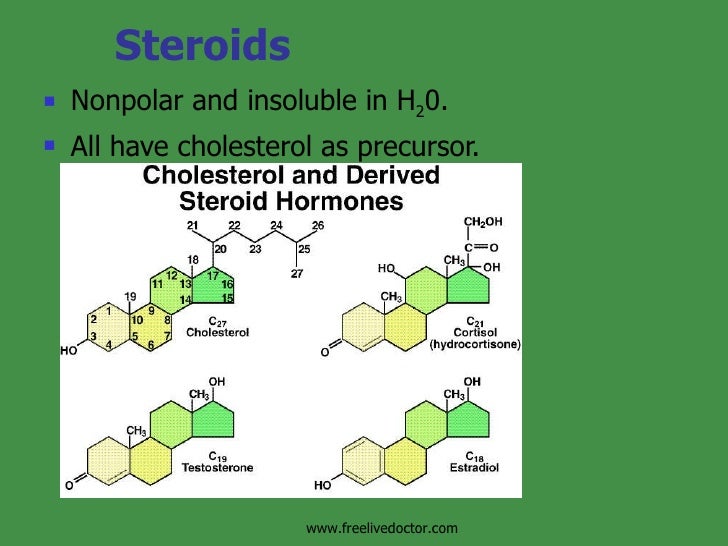 - 52. Steroids Nonpolar and insoluble in H 2 0. All have cholesterol as precursor. www.freelivedoctor.com