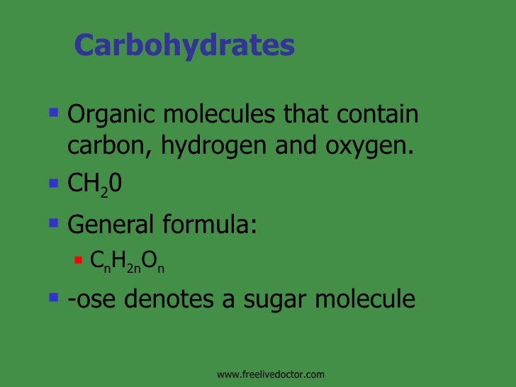 - 55. Carbohydrates Organic molecules that contain carbon, hydrogen and oxygen. CH 2 0 General formula: C n H 2n O n -ose denotes a sugar molecule www.freelivedoctor.com