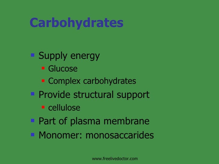 - 56. Carbohydrates Supply energy Glucose Complex carbohydrates Provide structural support cellulose Part of plasma membrane Monomer: monosaccarides www.freelivedoctor.com