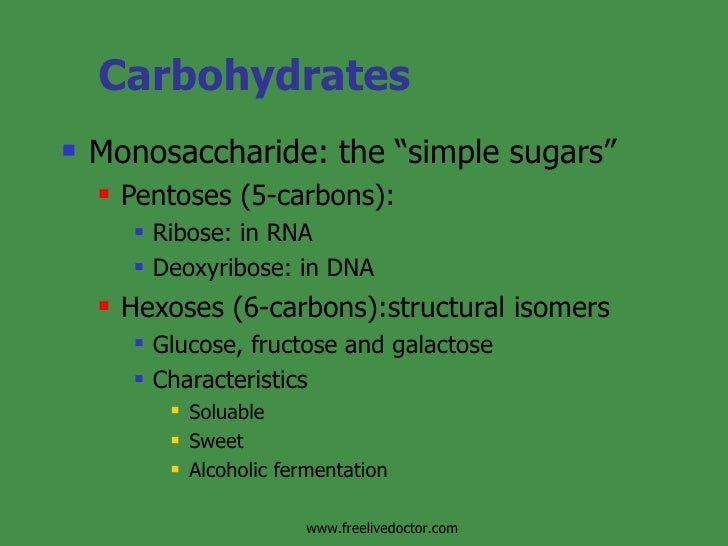 - 57. Carbohydrates Monosaccharide: the “simple sugars” Pentoses (5-carbons): Ribose: in RNA Deoxyribose: in DNA Hexoses (6-carbons):structural isomers Glucose, fructose and galactose Characteristics Soluable Sweet Alcoholic fermentation www.freelivedoctor.com