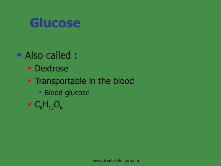 - 58. Glucose Also called : Dextrose Transportable in the blood Blood glucose C 6 H 12 O 6 www.freelivedoctor.com