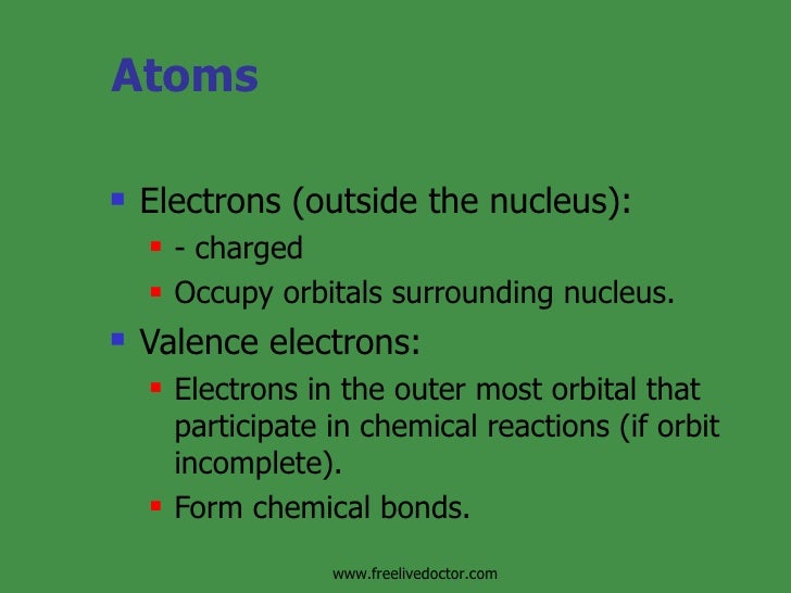 - 6. Atoms Electrons (outside the nucleus): - charged Occupy orbitals surrounding nucleus. Valence electrons: Electrons in the outer most orbital that participate in chemical reactions (if orbit incomplete). Form chemical bonds. www.freelivedoctor.com