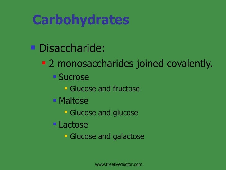 - 62. Carbohydrates Disaccharide: 2 monosaccharides joined covalently. Sucrose Glucose and fructose Maltose Glucose and glucose Lactose Glucose and galactose www.freelivedoctor.com
