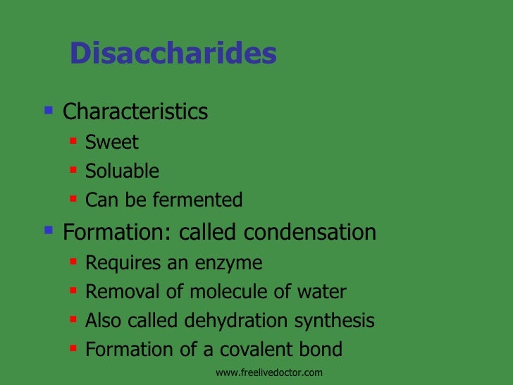 - 63. Disaccharides Characteristics Sweet Soluable Can be fermented Formation: called condensation Requires an enzyme Removal of molecule of water Also called dehydration synthesis Formation of a covalent bond www.freelivedoctor.com