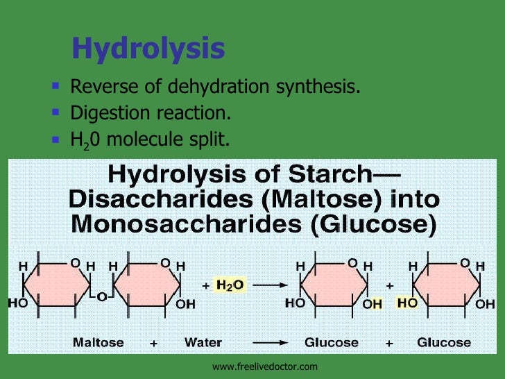 - 65. Hydrolysis Reverse of dehydration synthesis. Digestion reaction. H 2 0 molecule split. www.freelivedoctor.com